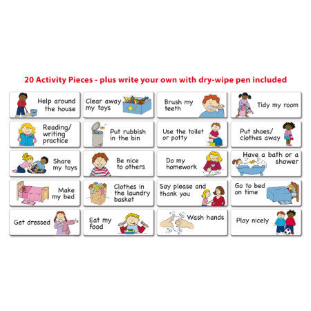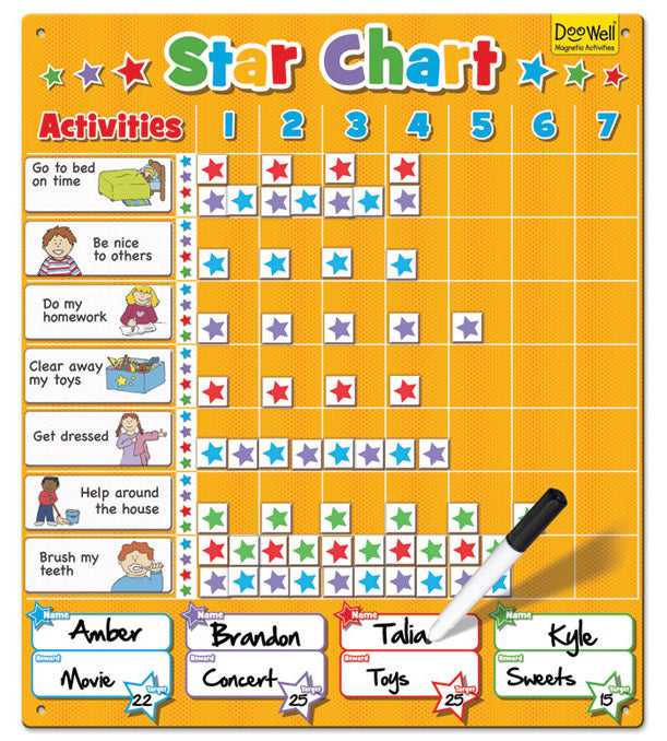 Make rewarding behaviours fun with the Fiesta Crafts Family Star Chart. This magnetic reward chart which can be used for up to 4 children and over a one week period. Choose from the 14 suggested activities or make your own with the blank pieces provided. Comes complete with over 200 magnetic pieces.