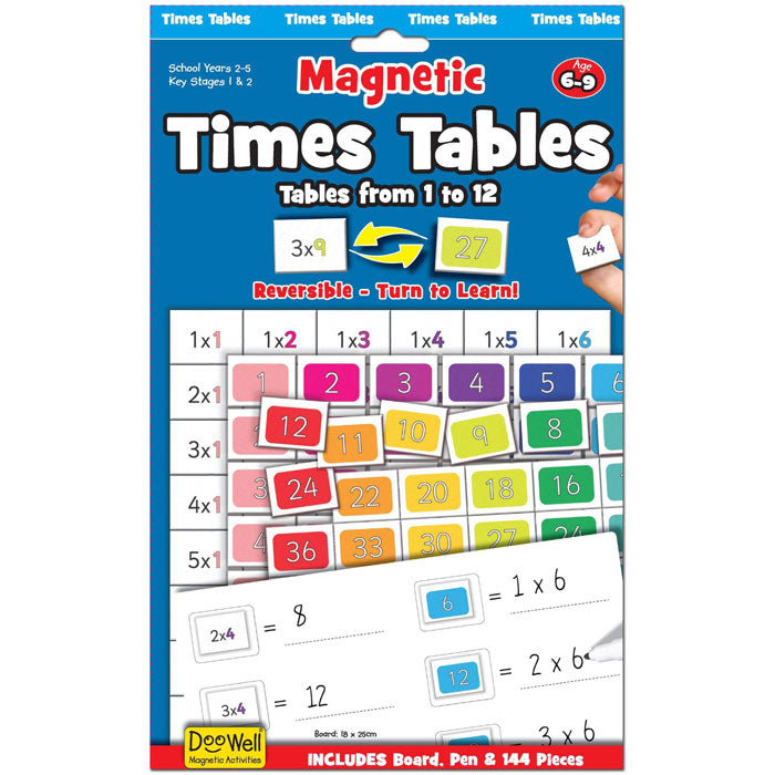 Make learning the times tables interactive and fun! Fiesta has produced a set that includes the tables from 1 through 12 with magnetic pieces, backing board and erasable pen. Each table is colour coded and the 144 magnetic pieces are reversible. Each piece has the colour coded number to multiply on one side and on the reverse is the answer so that you can work backwards. The board holds two columns so you can do two series at once.
