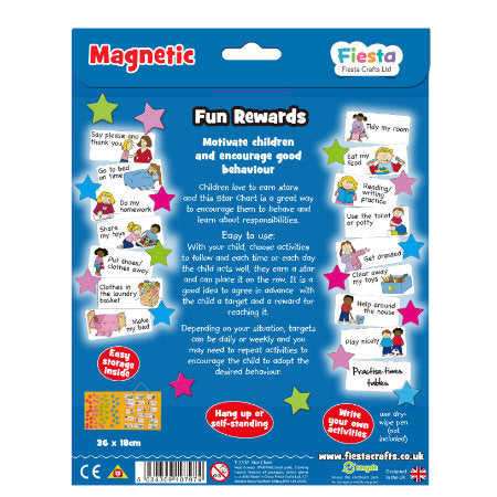 Make rewarding behaviours fun with the Fiesta Crafts Star Chart. This magnetic reward chart can be used for either one child or multiple children over a number of days. Choose from the 14 suggested activities or make your own with the blank pieces provided. Comes complete with 80 magnetic pieces and handy hanging cord.